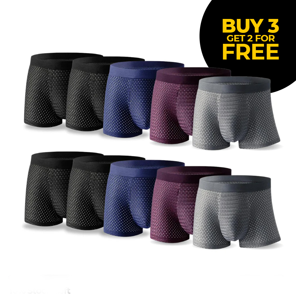 The Buy 3 Get 2 Free Bamboo Fiber Offer A No-Roll Waistband, Hypoallergenic Fabric, And Anti-Odour Fiber Technology For All-Day Comfort, With Hero Mesh Cooling Zones, A Supportive Pouch, And Pre-Shrunk Fabric to Ensure Perfect Fit And Lasting Freshness.